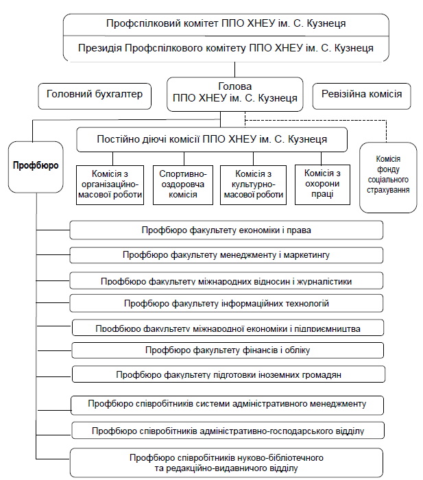 Діяльність та структура первинної профспілкової організації ХНЕУ відповідає вимогам Галузевого статуту, Закону України «Про професійні спілки, їх права та гарантії діяльності». Постановою президії Харківської обласної організації профспілки працівників освіти і науки України затверджені Положення про профспілкові організації, якими передбачені координація та узгодженість дій всіх ланок профспілки щодо реалізації своїх прав і повноважень у повній мірі.